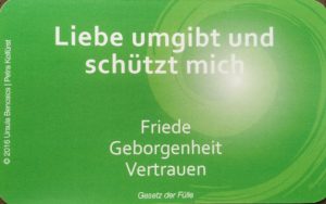 Zuerst entscheide ich mich für ein Kartenset (sehr gerne nehme ich eines von meinen persönlichen Sets „NaturKraft“ oder „BaumKraft“). Heute nehme ich die „NaturKraftKarten“ – dann mische ich diese, um mich bewusst „in den Moment“ zu holen – und DANN zieh ich mir spontan, vor allem „ohne Hirneinmischung“ eine Karte….